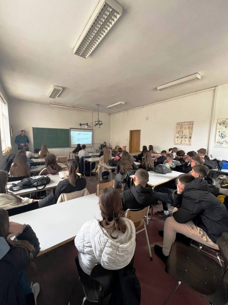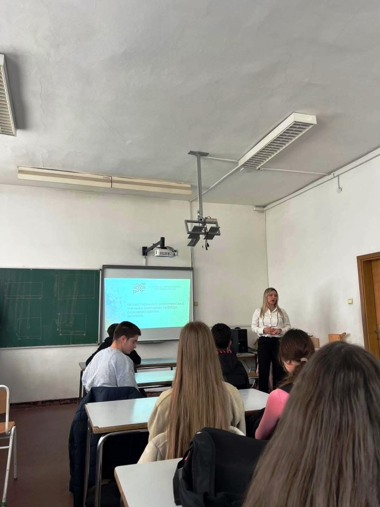 Дана 2.4.2026. године у просторијама наше школе Љиљана Станковић, виши стручни сарадник у Клубу за тражење посла испред ЈУ Завода за запошљавање Републике Српске, одржала је предавање на тему професионалне оријентације за ученике деветих разреда. Посебна пажња посвећена је информисању ученика о могућностима даљег образовања и развоју кључних компетенција потребних за успјешно укључивање на тржиште рада.