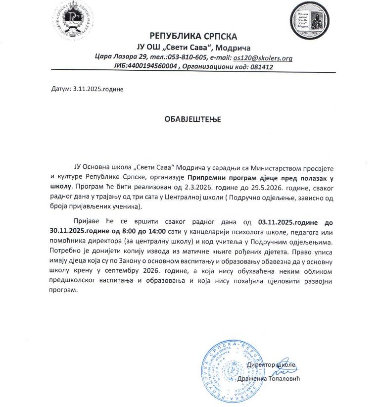 ЈУ Основна школа „Свети Сава“, Цара Лазара 29, 74480 Модрича